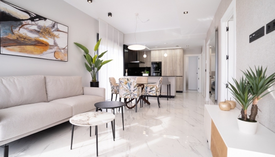 Новые современные квартиры с 2 спальнями и 2 ванными комнатами, с кухней,выходящей в гостиную. Предлагается несколько моделей на выбор. Квартиры нижнего этажа с террасой и садом, квартиры верхнего этажа - с солярием.