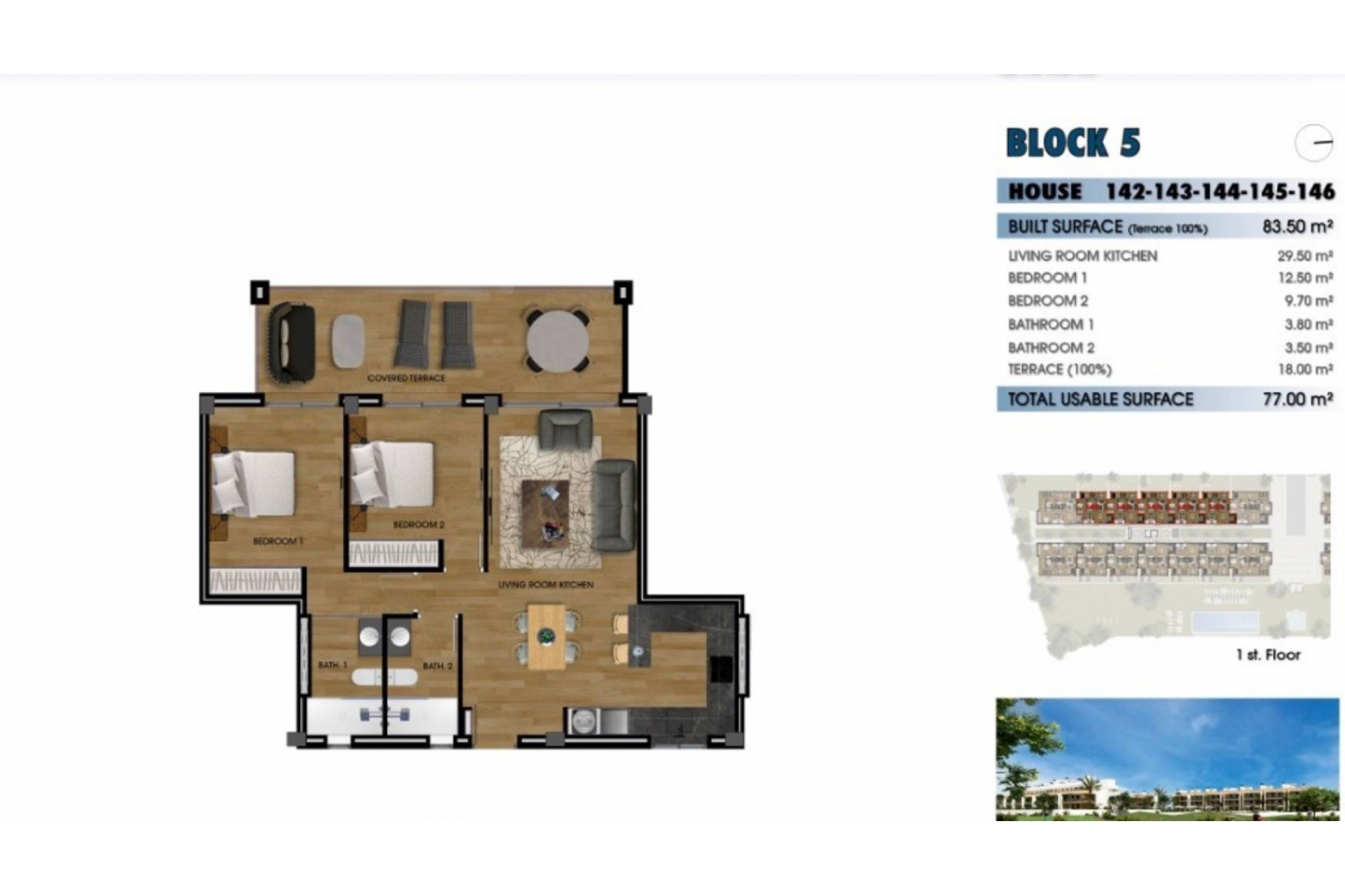 Vårt nya bostadsprojekt består av 8 block med totalt 244 moderna lägenheter med 2 eller 3 sovrum, belägna inne på den prestigefyllda golfbanan La Serena Golf i Los Alcázares. Lägenheterna på markplan har vackra privata trädgårdar – vissa med egen pool – medan takvåningarna erbjuder ett privat solarium med direkt tillgång inifrån bostaden, en perfekt plats att njuta av solen på Costa Cálida.